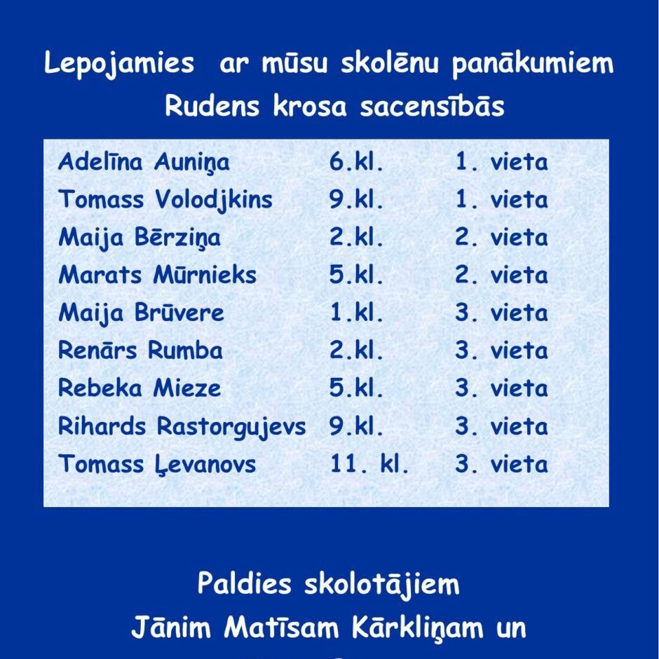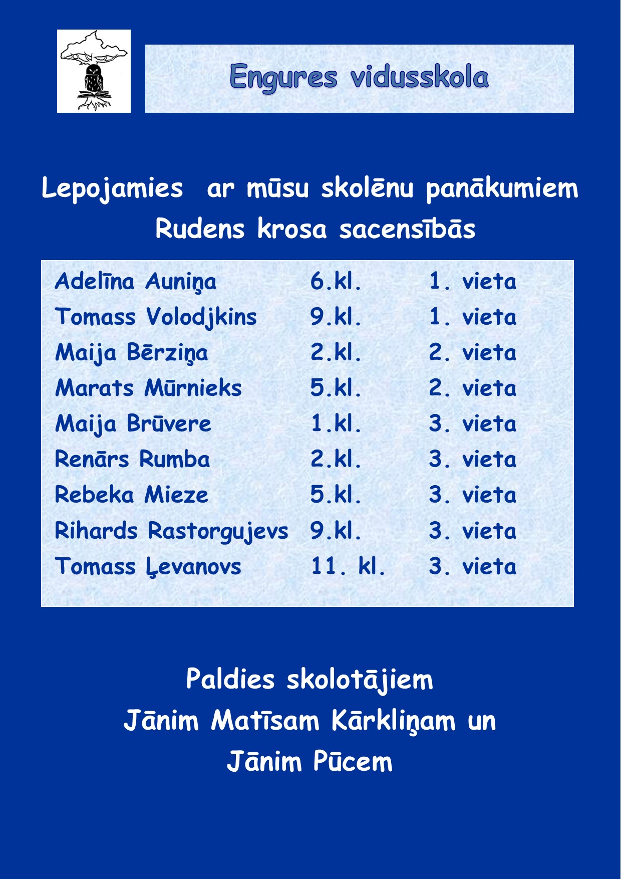 23. 09. Tukuma Pilsētas parkā valdīja sportiska noskaņa – norisinājās Tukuma novada vispārizglītojošo skolu sacensības Rudens krosā 2025. Pasākumā startēja vairāk nekā 340 dalībnieku no dažādām novada skolām, un tas pulcēja gan pieredzējušus skrējējus, gan jaunos sportistus, kuri vēl tikai uzkrāj sacensību pieredzi. Engures vidusskolu pārstāvēja 25 dalībnieki. Lepojamies ar mūsu skolēni iegūtajiem augstajiem sasniegumiem tik daudzskaitlīgā sporta pasākumā, kas vienoja gan sportistus, gan līdzjutējus.