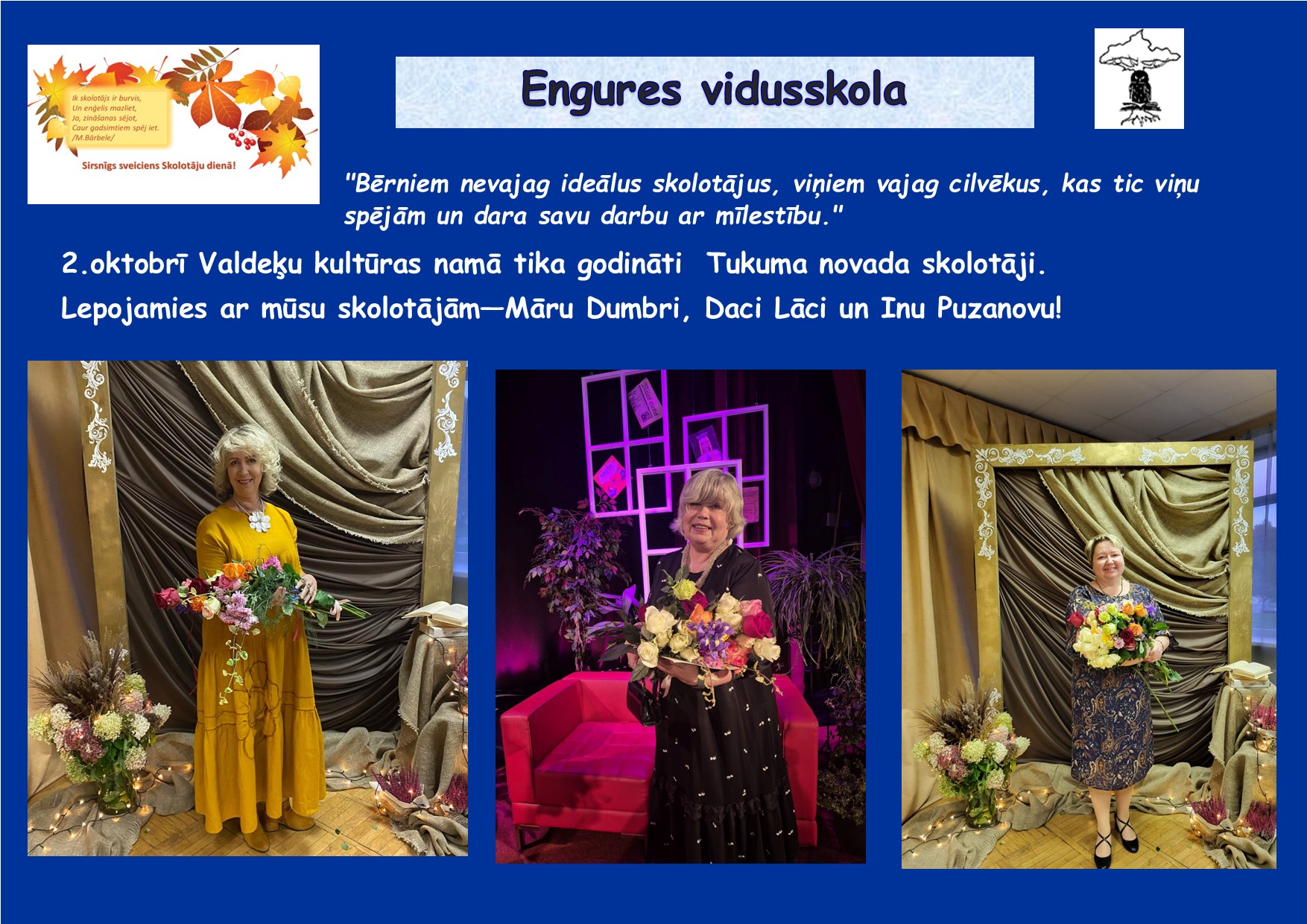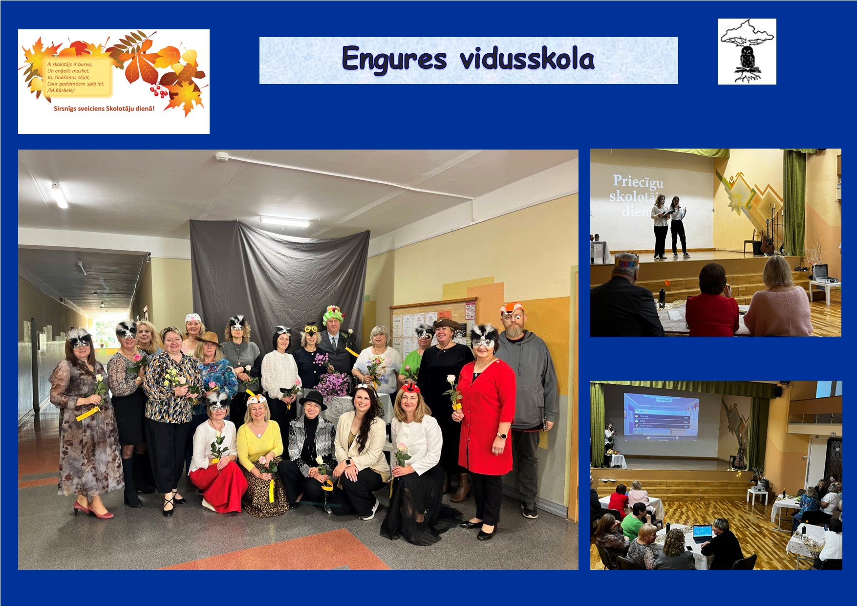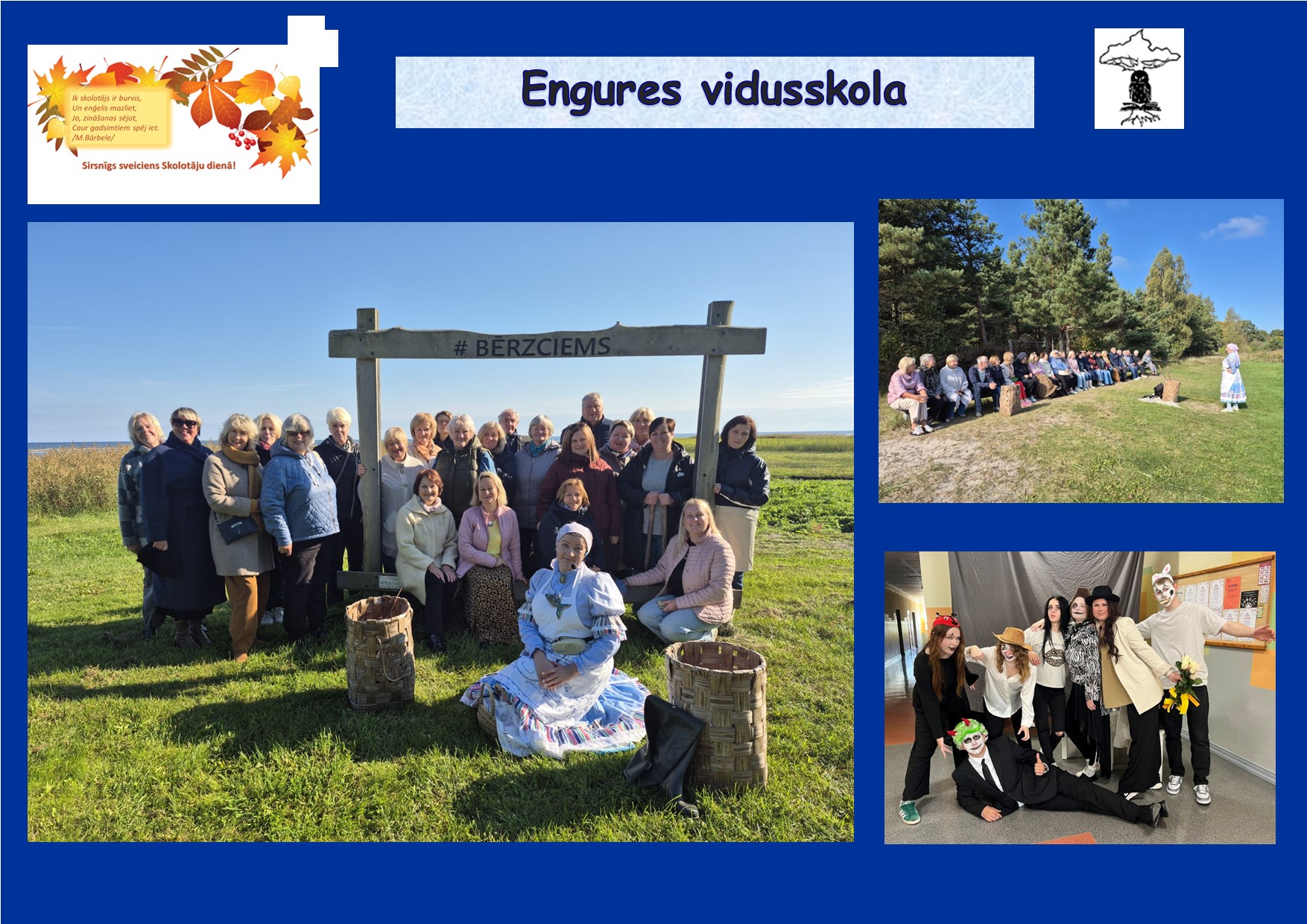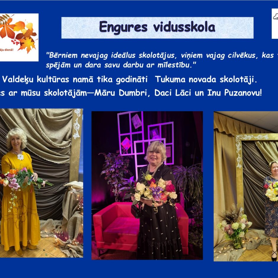 3. oktobrī 12.klases skolēni sadarbībā ar 10. un 11. klases skolēniem organizēja Skolotāju dienu Engures vidusskolā.10. un 11.klases skolēni vadīja mācību stundas jaunākajām klasēm, bet 12. klases skolēni pasākumā “Nopietni nenopietni” lika skolotājiem atbildēt uz āķīgiem un jautriem jautājumiem kā arī varējām kopīgi baudīt sarūpēto muzikālo svaicienu. Svētku noslēgumā skolotāji kopā ar skolas tehniskajiem darbiniekiem baudīja svētku noskaņu zvejnieku sētā “Dieniņas”, tiekoties ar mutīgo un čadīgo saimnieci Ivetu Celkarti.